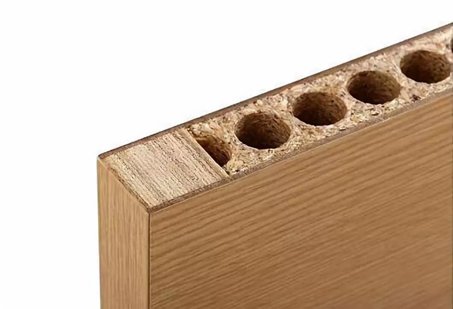 2. Hollow core particle board: Also called bridge mechanical board, it is a kind of wood-filling material. It has been improved from the early parallel hole board to the cross hole board. It has increased its strength and has some improvements in its anti-deformation ability. However, the adhesive used in the production process is the use of thermosetting urea-formaldehyde resin. It is difficult to control the amount of free formaldehyde volatilization in the use process, which will bring us health problems. Particleboard easily absorbs water and warps in humid environments and humid air. It easily gets mouldy during use. This is one of the main disadvantages of particleboard furniture.
